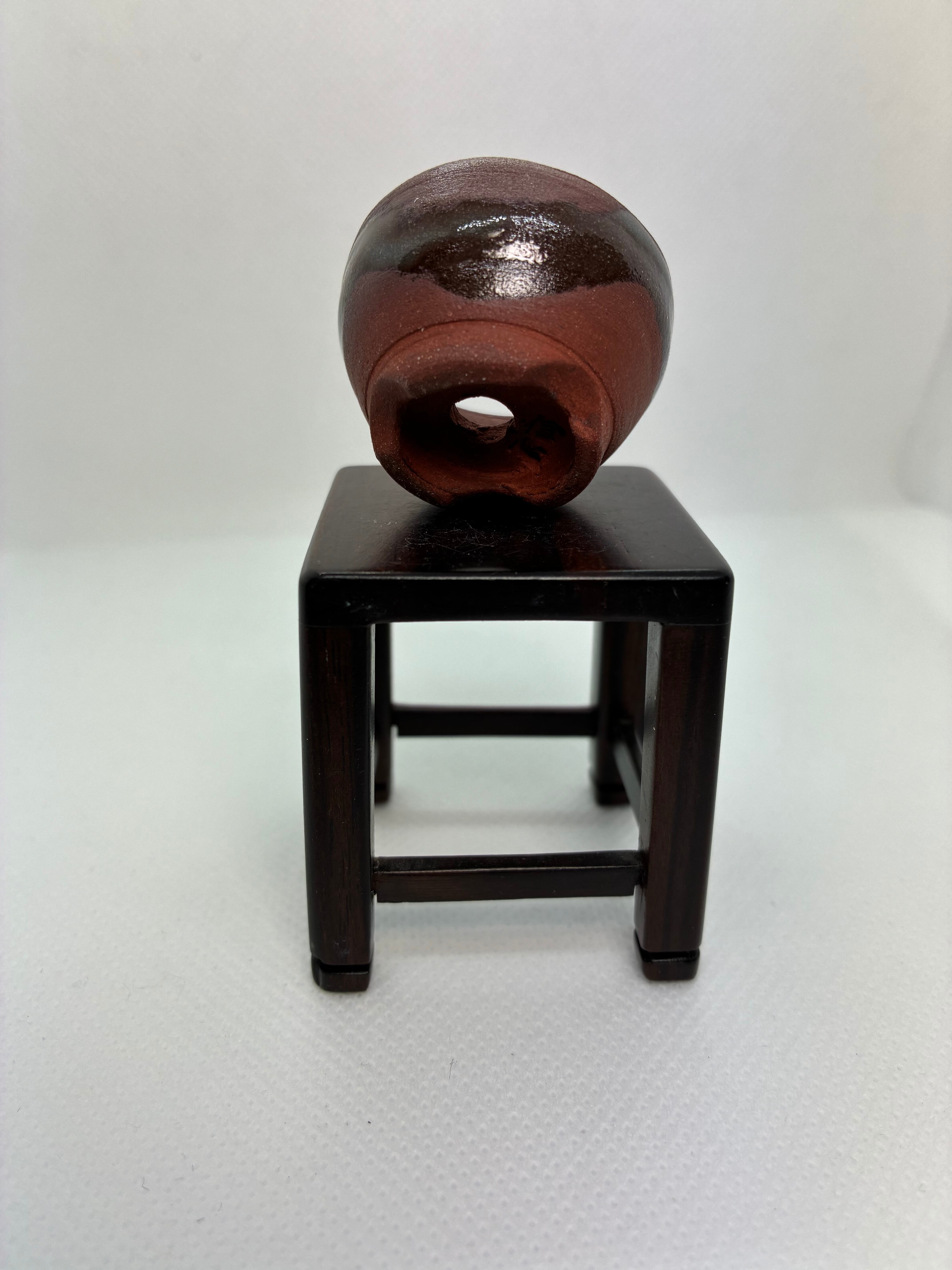 焼き締めてから釉薬を部分的にかけて仕上げました、サイズは外径3.4センチ高さ2.0センチです既製品ではあまり見かけないと思います、私はできるだけ既製品には無いような作品を作りたくて自作するようになりました。