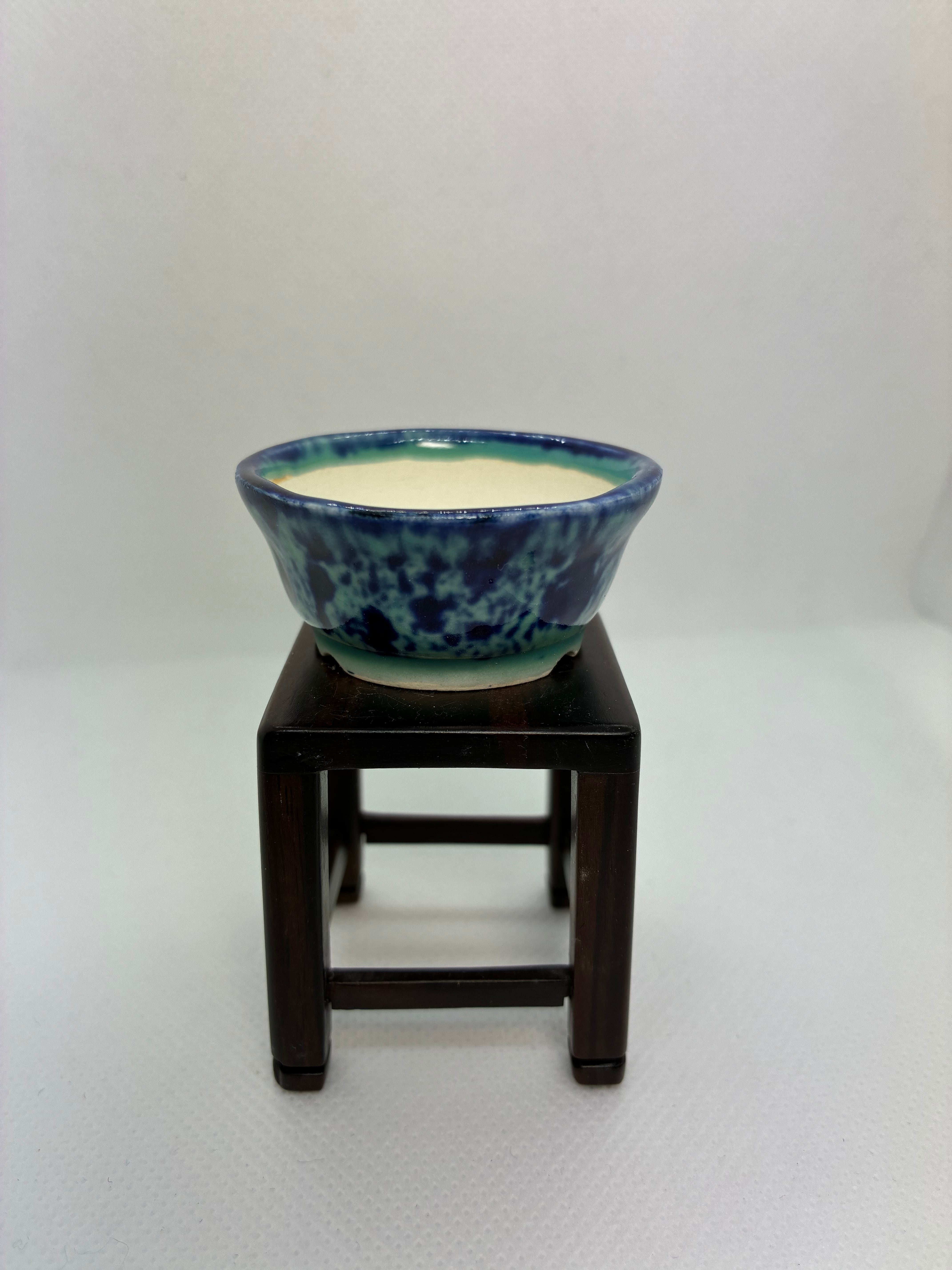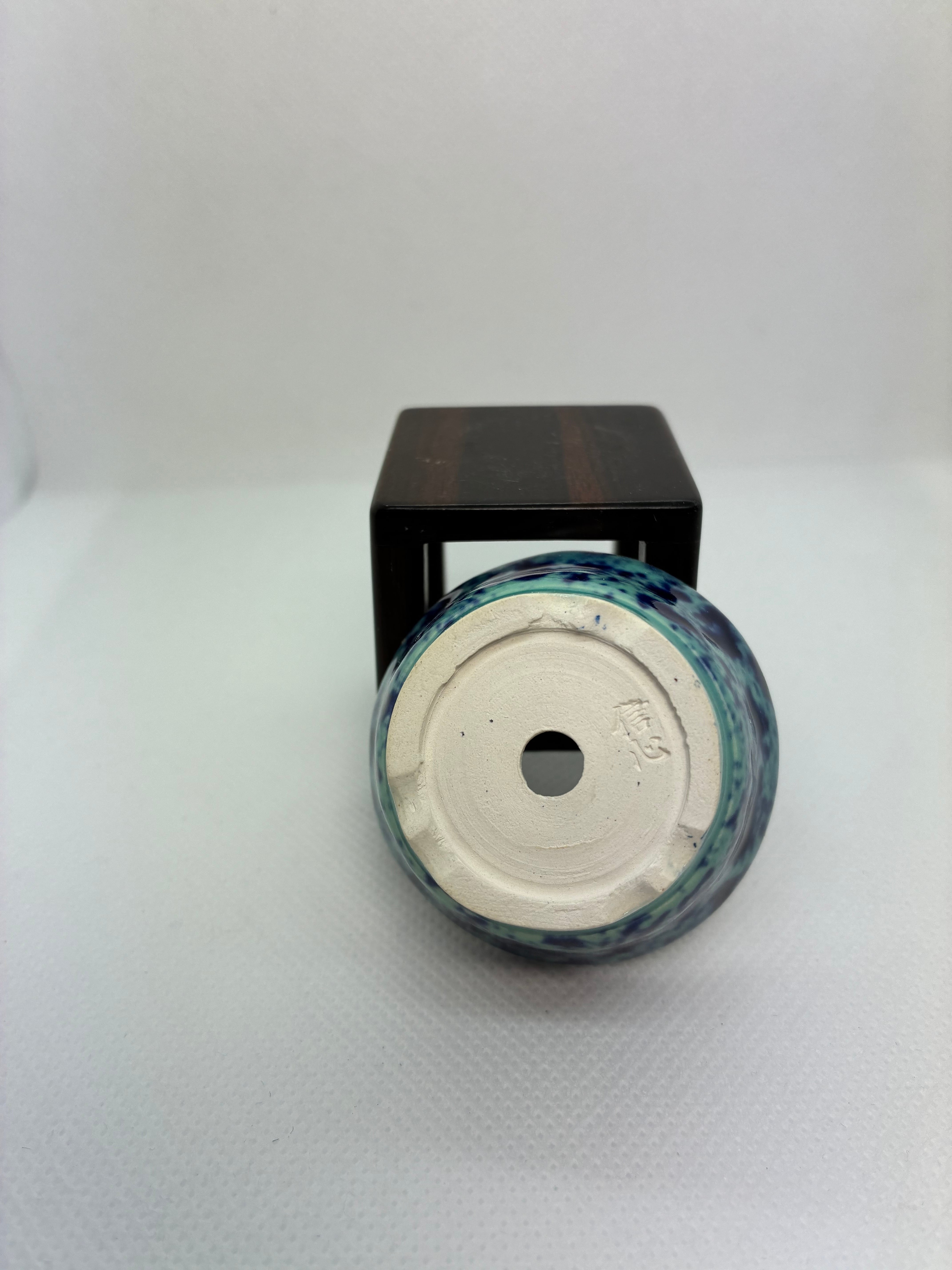 ボディーは個性的な模様が特徴です花物や実物などを入れて楽しめるかと思いますサイズは外径4.7センチ高さ2.2センチです私の作品のなかでは大きいつくりになっています。
