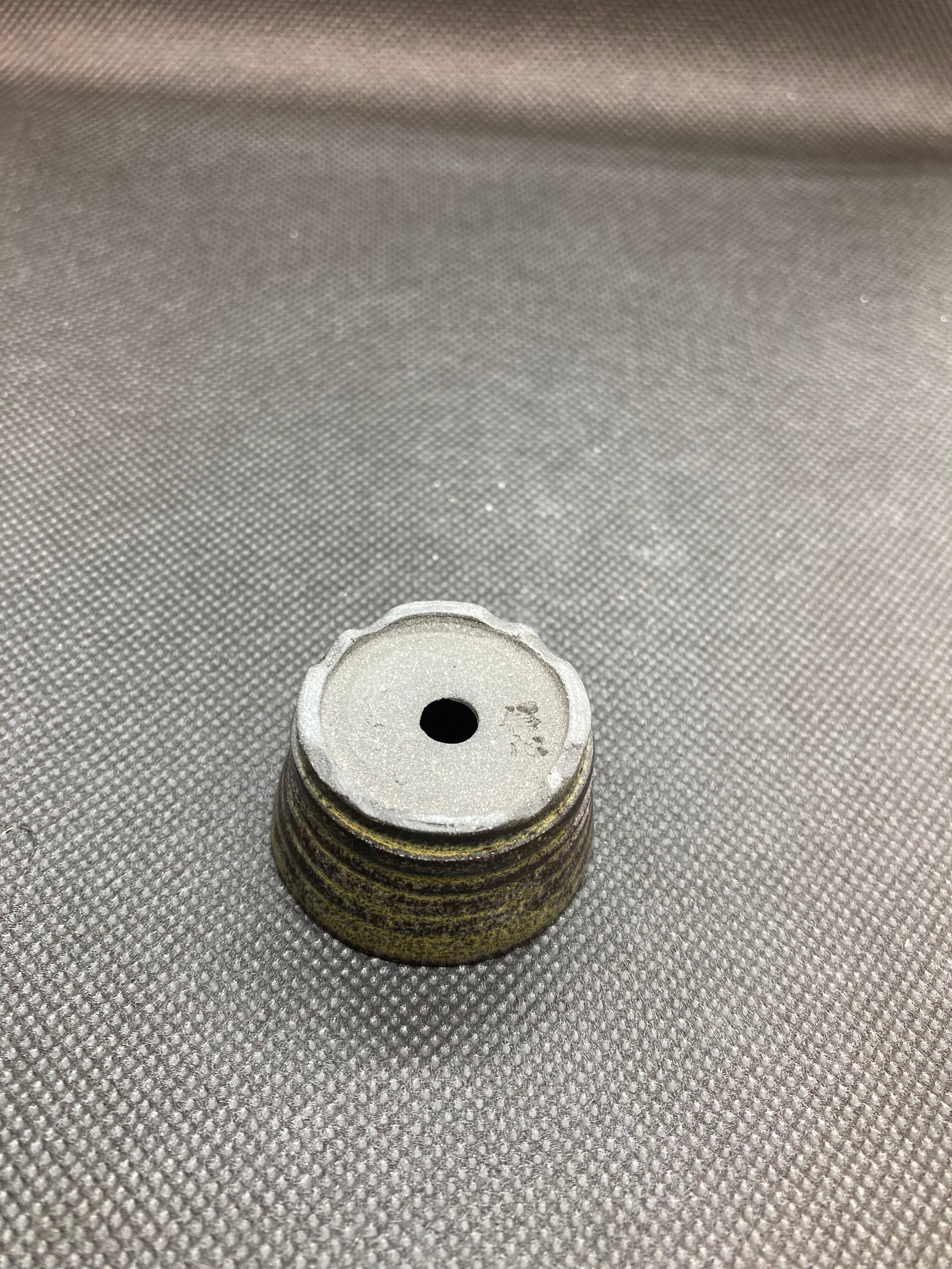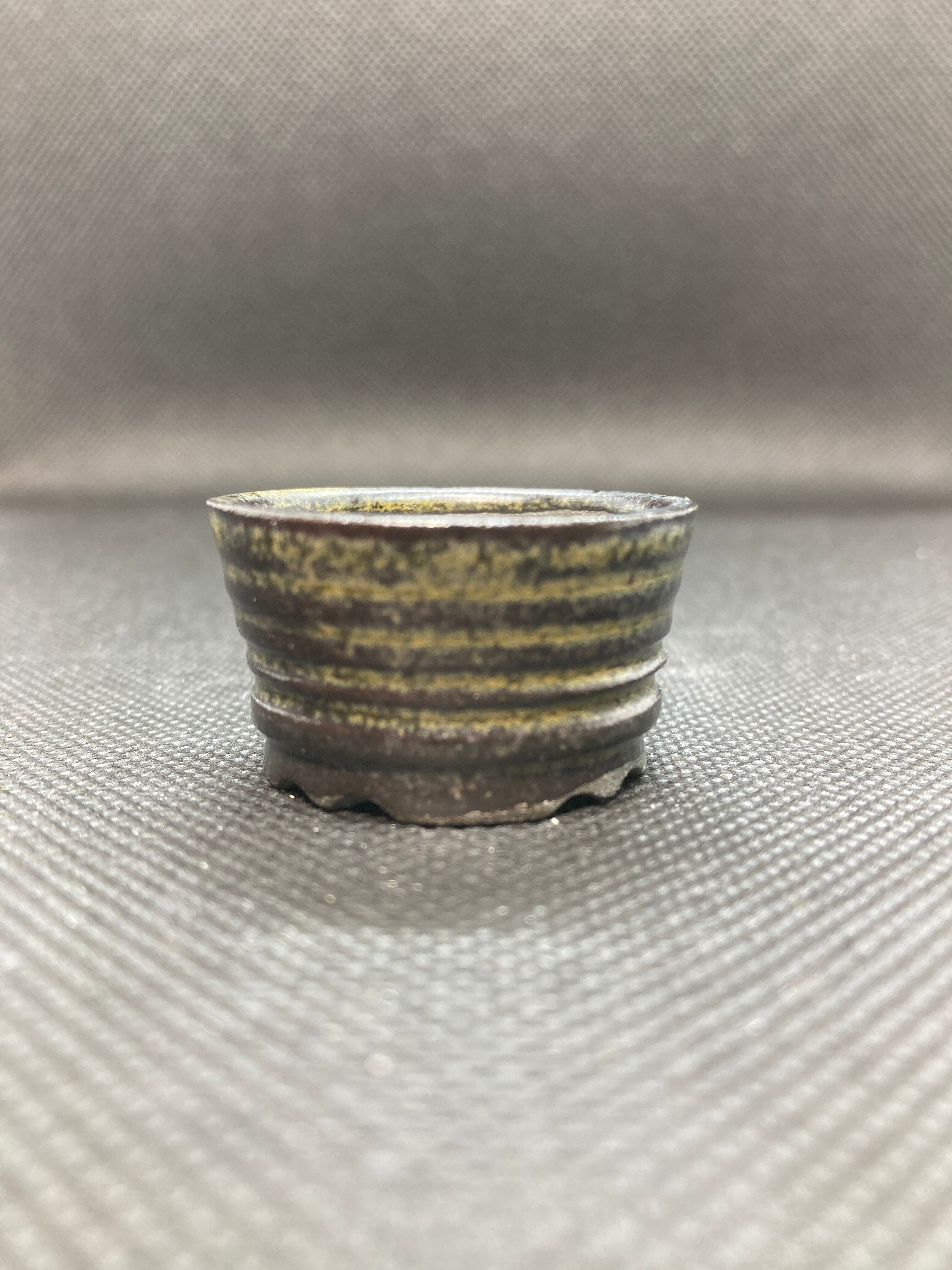 ボディに凹凸をつけて削っています。削れた部分には釉薬が溜まって窯変が出ています。サイズは外径3.7センチ 高さ2センチです,樹種は比較的