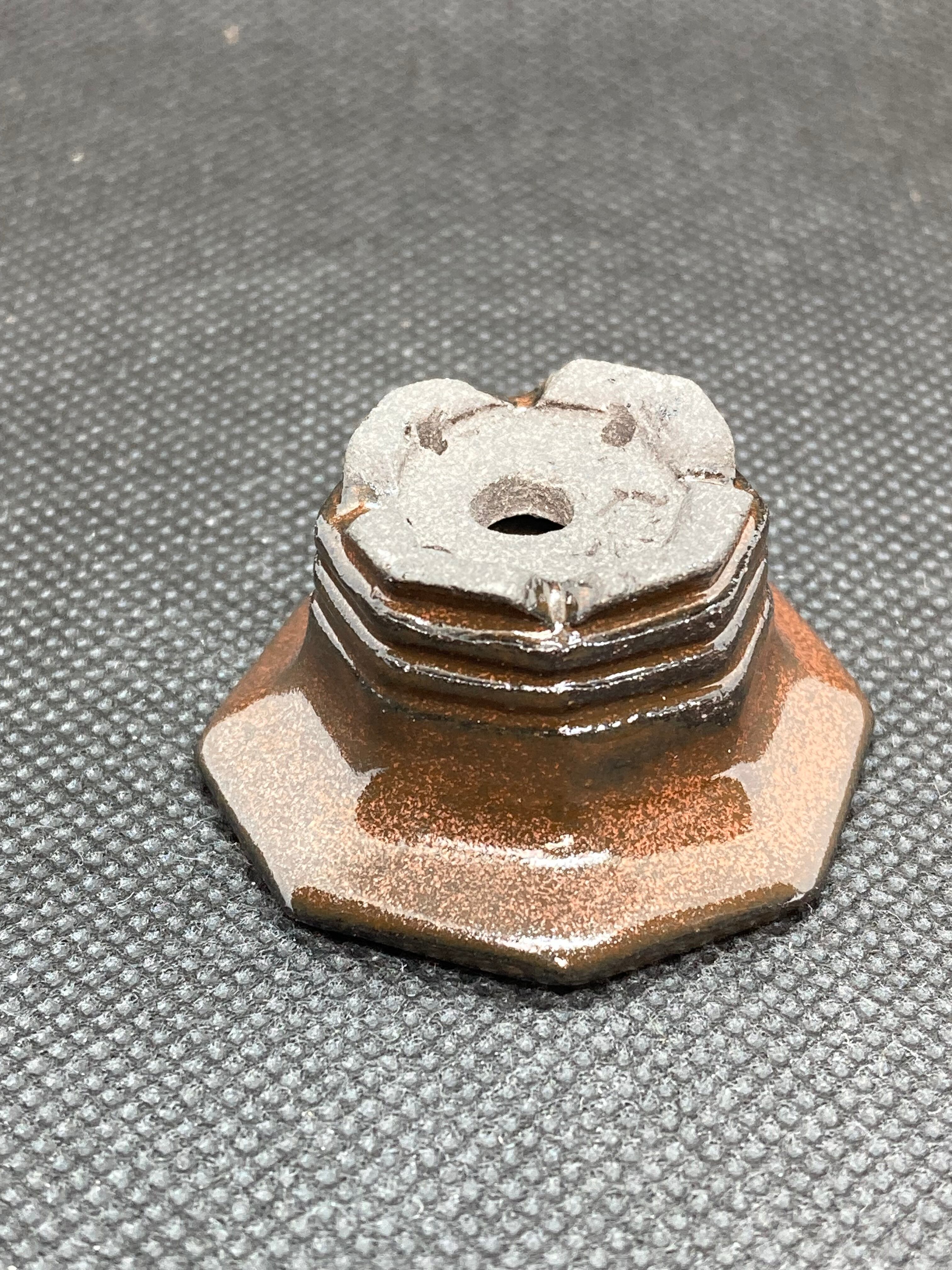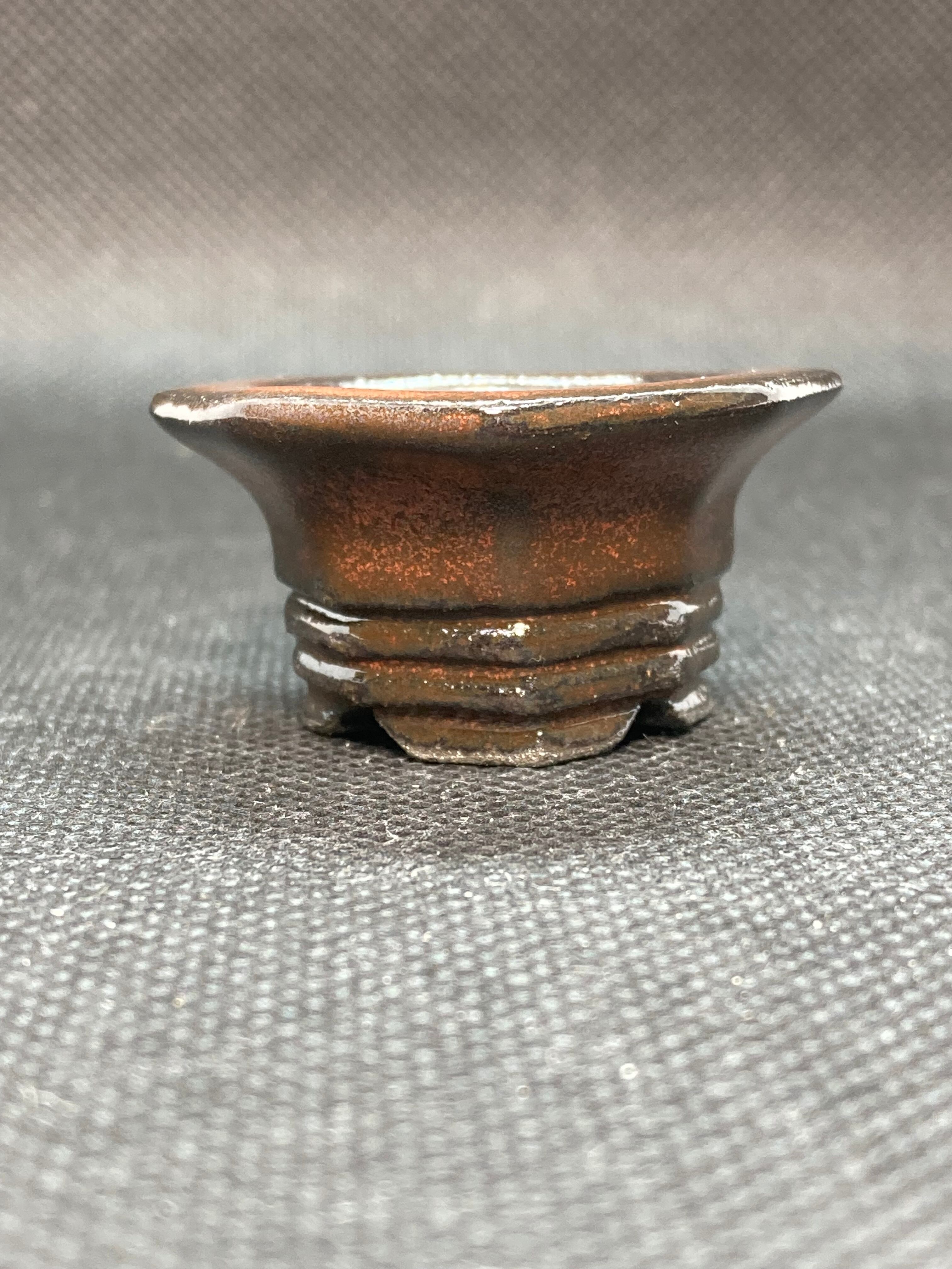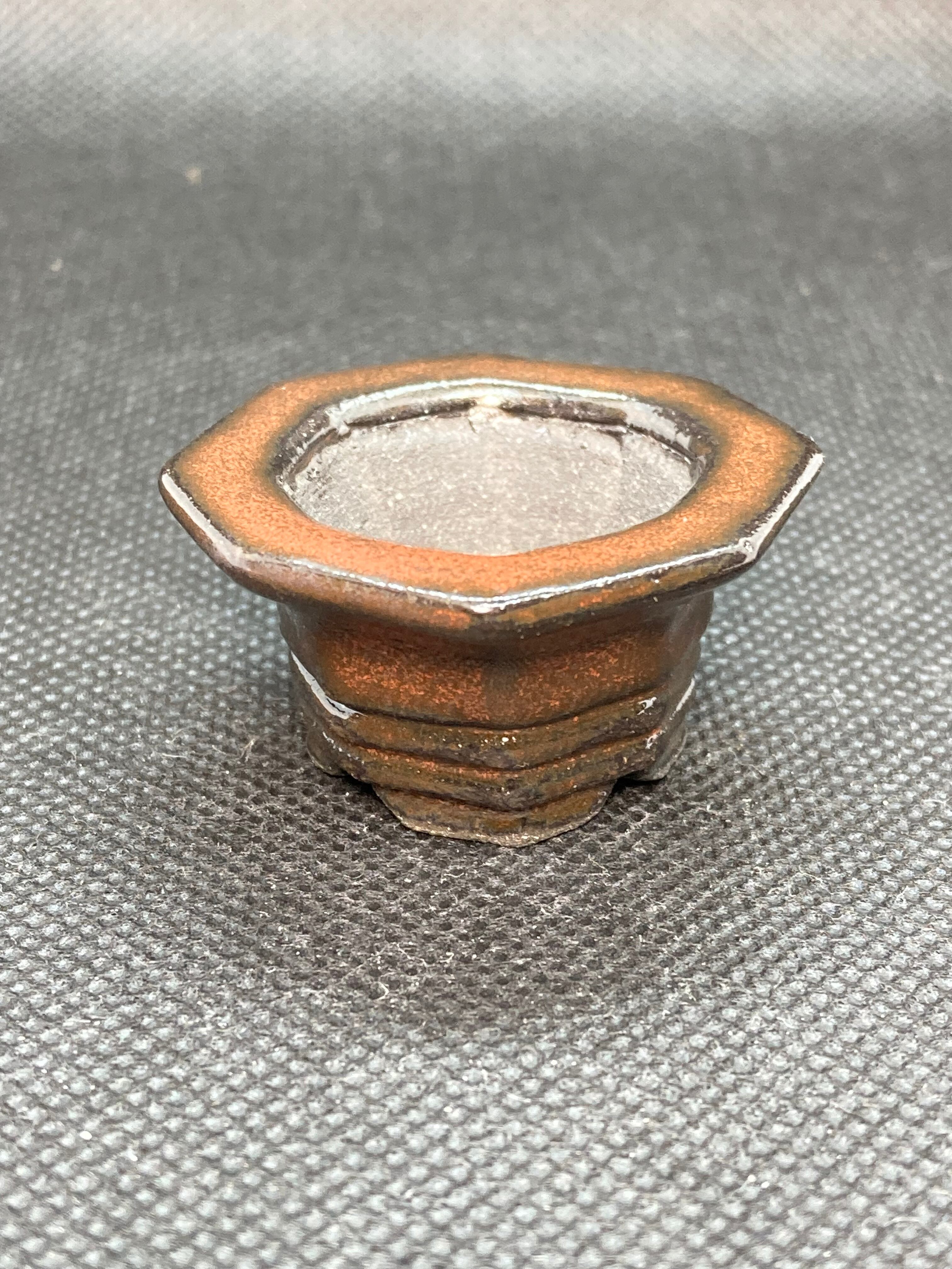 天広六角鉢のサイズは外径3.9センチ 高さ2センチです。色は茶色系ですがボディの上下に色の変化があり下の方は濃くなっております。個性的なデザインの仕上りなっております。