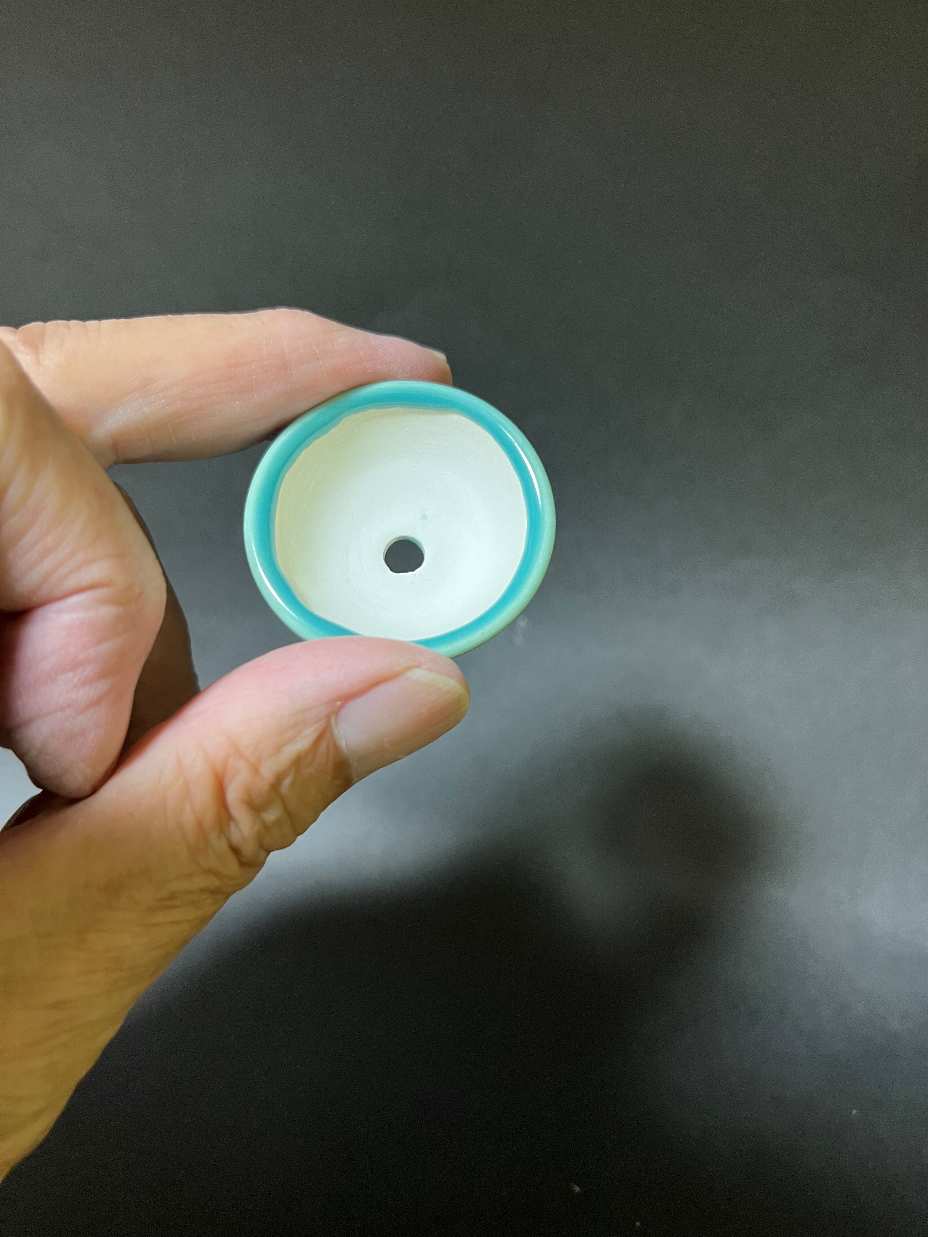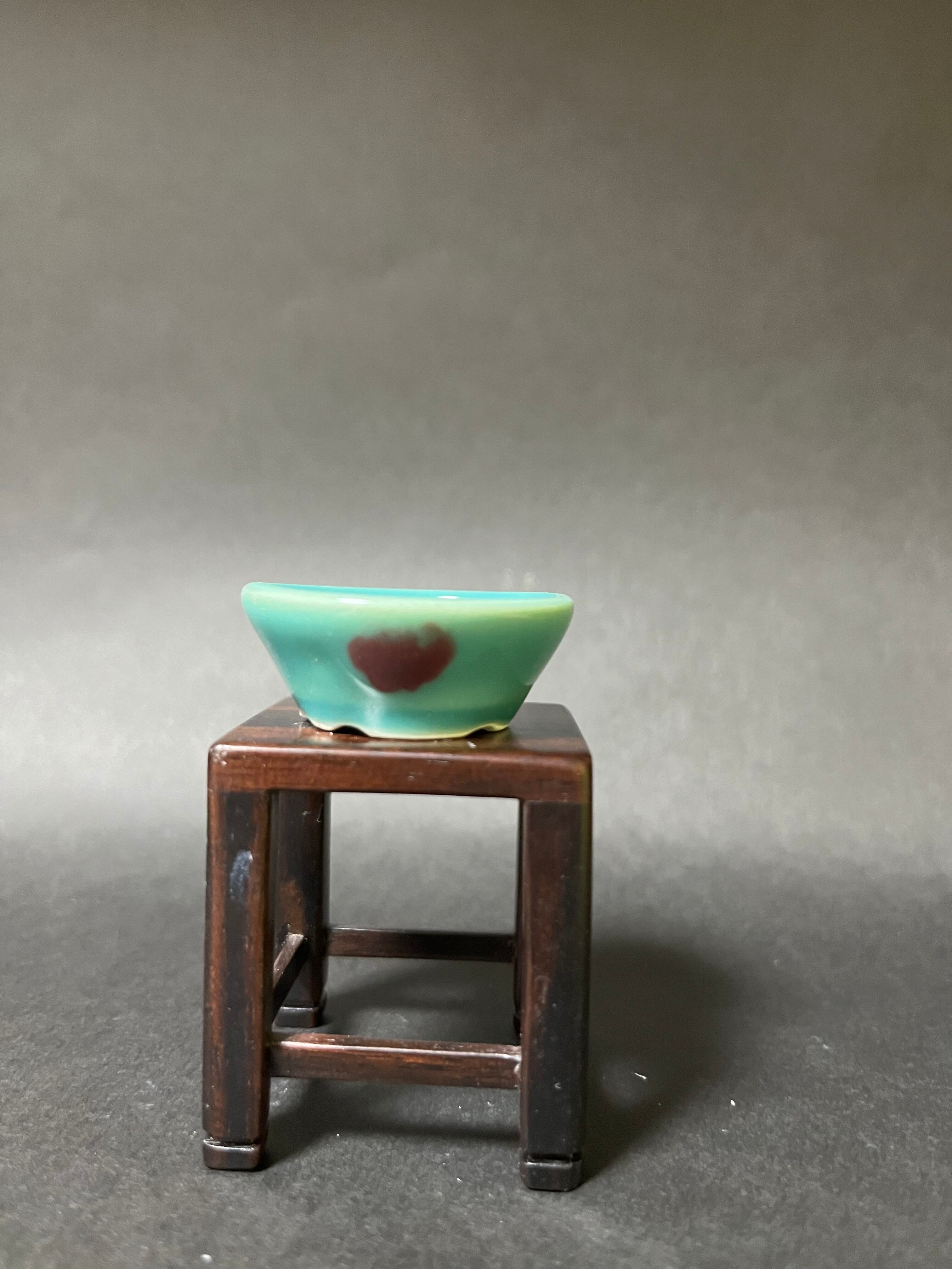青磁釉薬の上にアクセントてして他の釉薬を一滴垂らし表情を作った丸鉢に仕上がっております、いろいろな樹種に合わせて楽しめるかと思います。