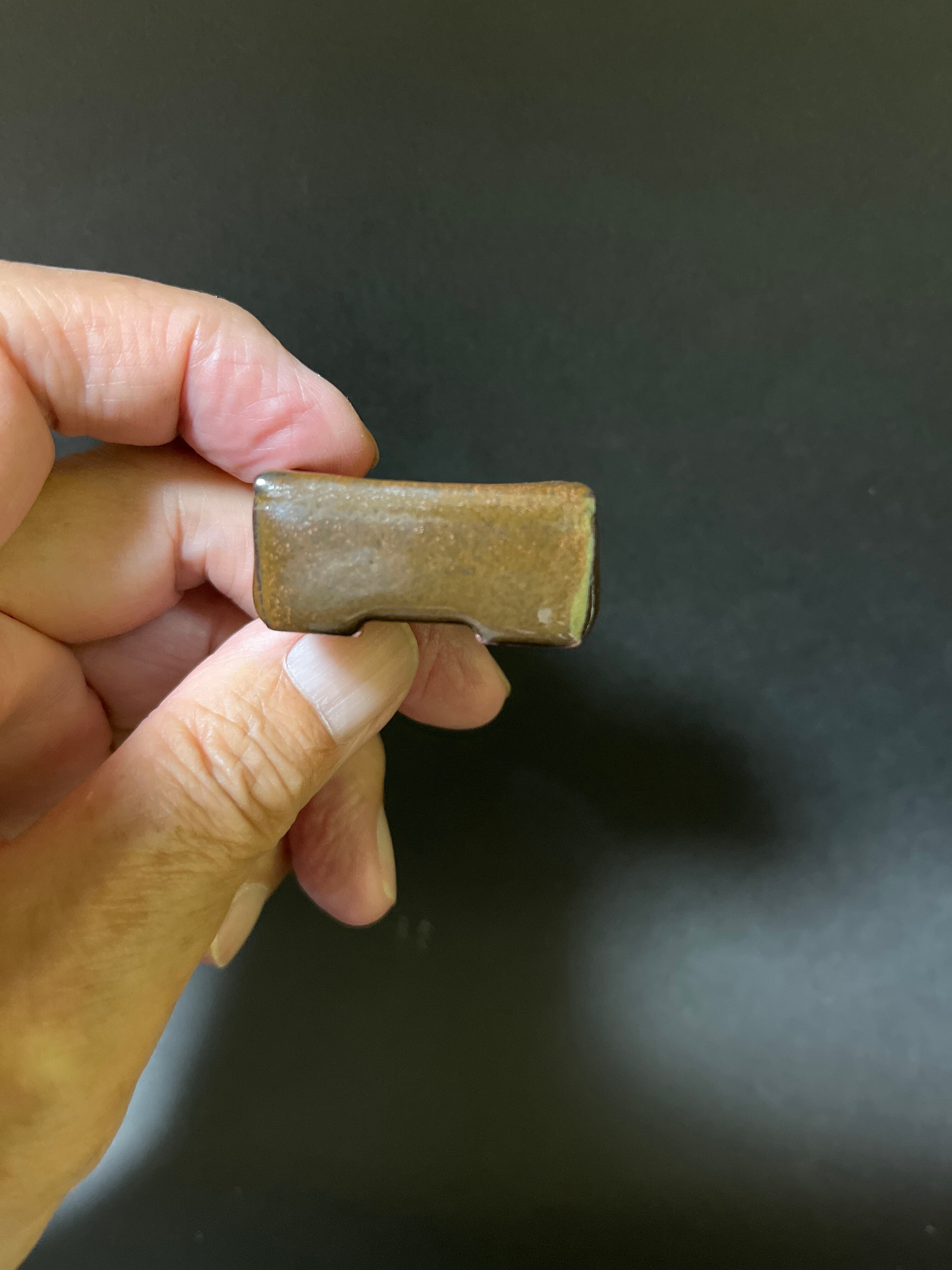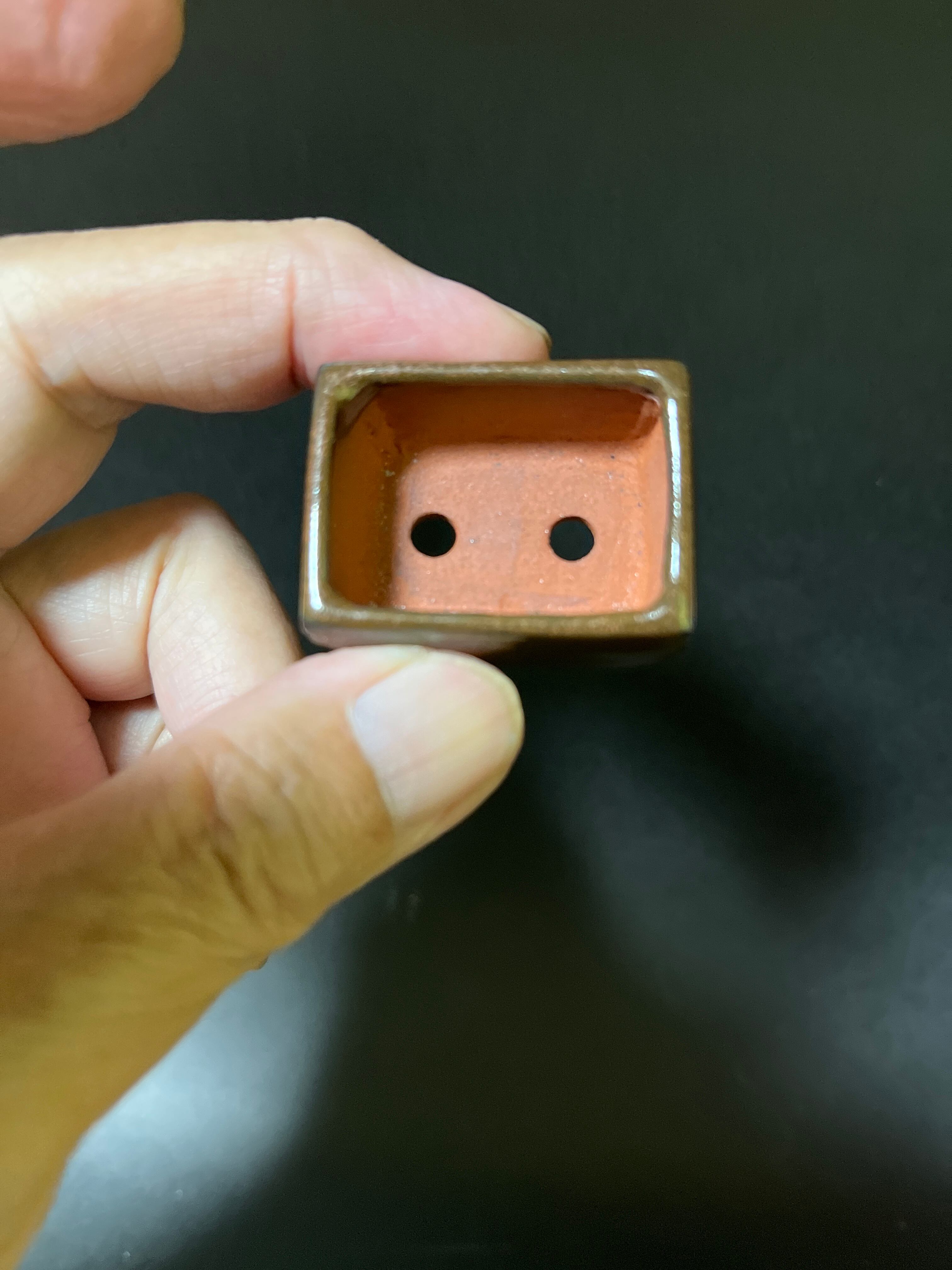 サイズは横幅3.5センチ 奥行き2.5センチ 高さ1.7センチです、色はチョコレート色で花物や実物などに合わせて楽しめるかと思います