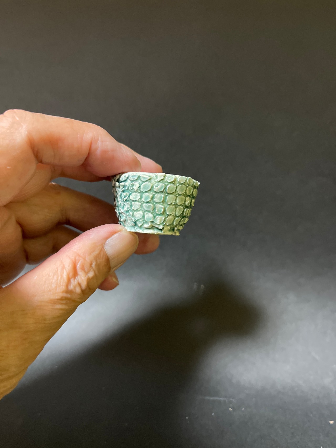 表面に凹凸の加工を施し個性的な表情をした作品に