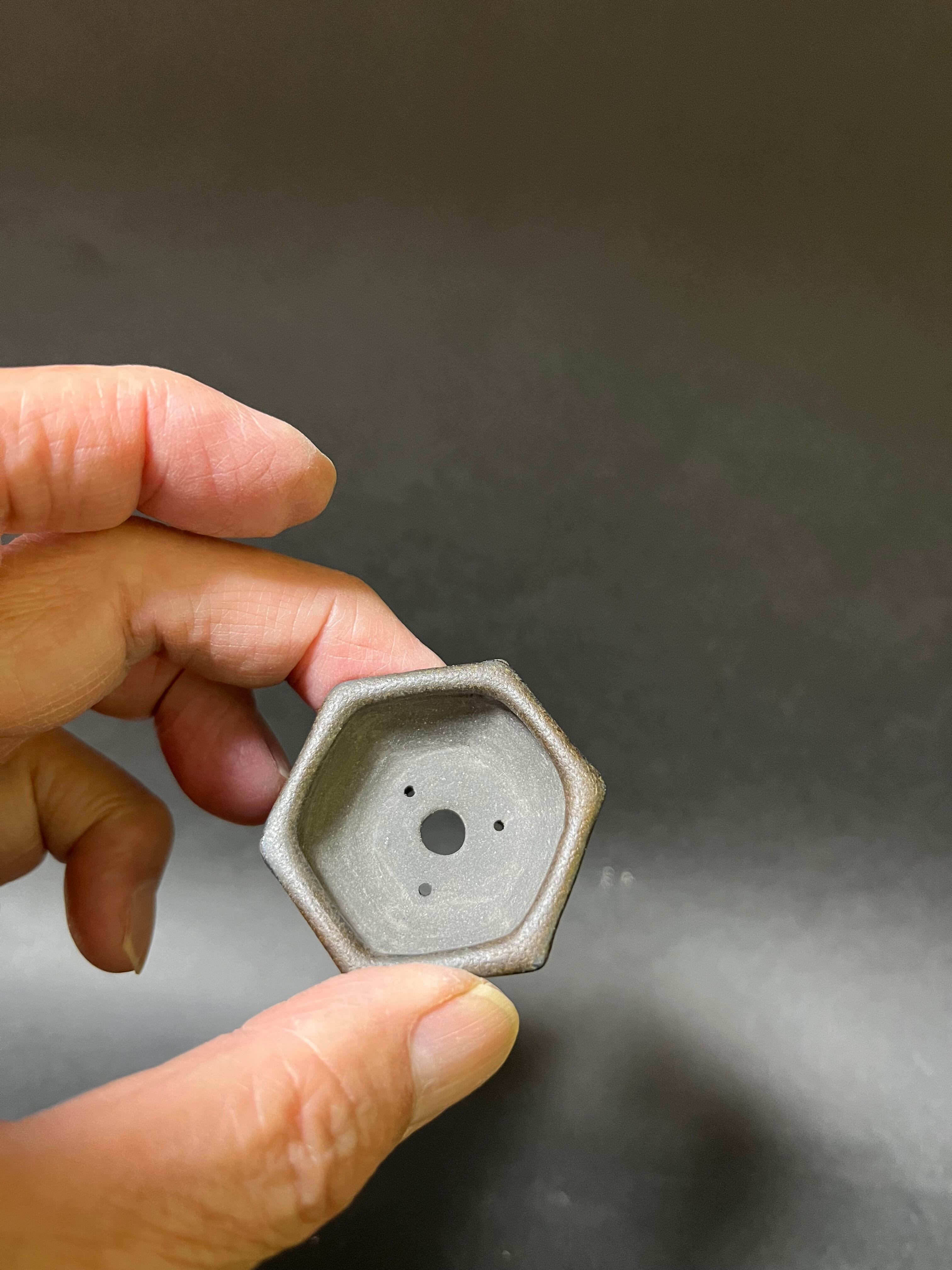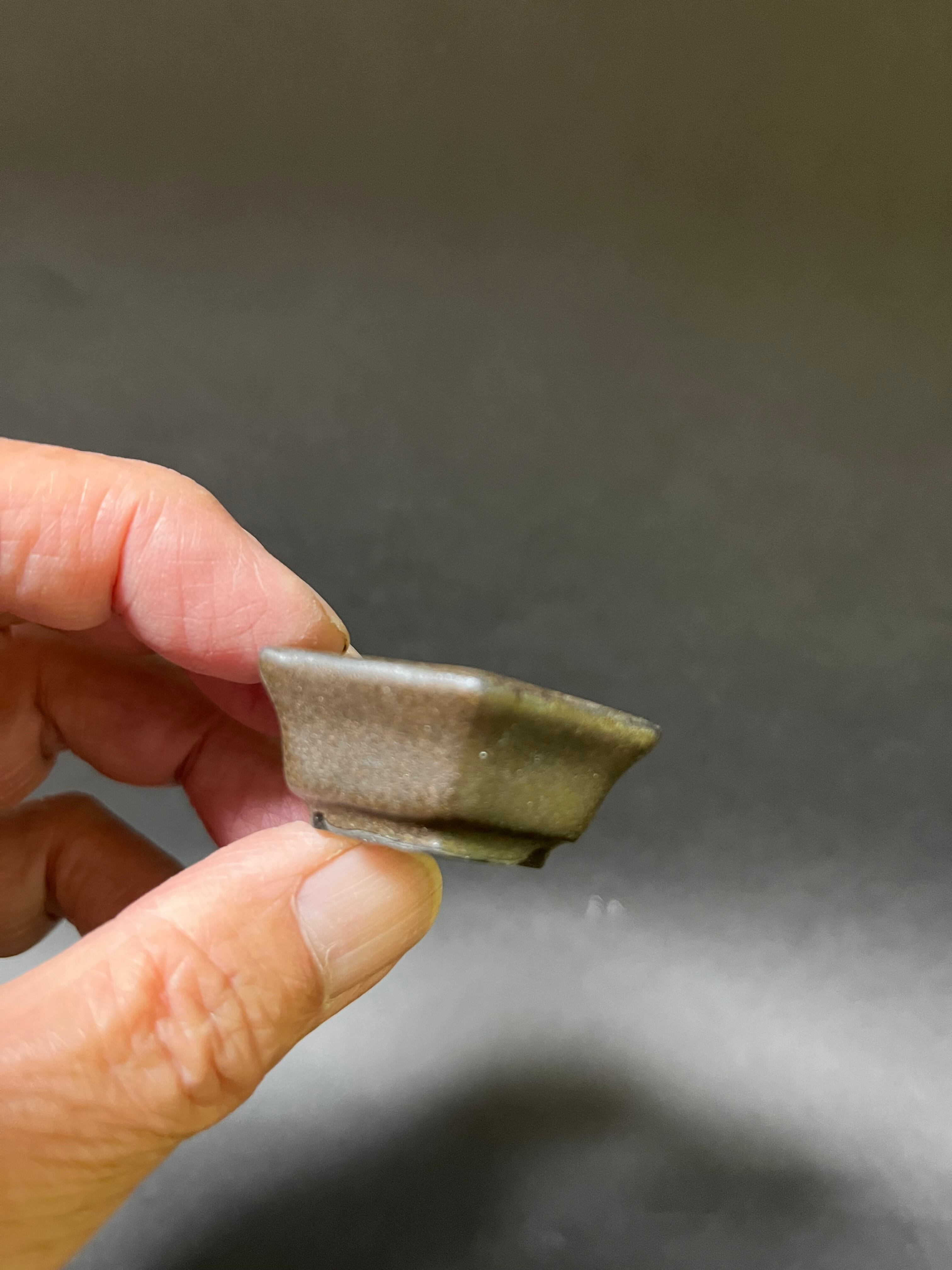 六角鉢のサイズは外径3.8センチ 高さ1.6センチです、アボガドのような深い色目に仕上がっております、落ち着いた感じでいろいろな樹種で合わせて楽しめるかと思います。
